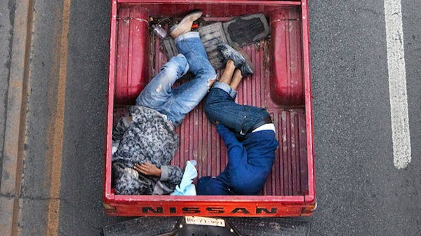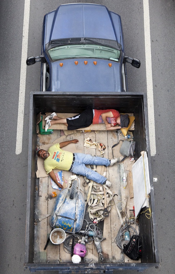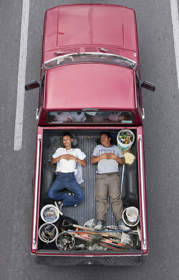 Alejandro Cartagena lleva más de un año capturando esta particular manera de viajar. «Me acerco una o dos veces a la semana a un puente peatonal localizado en una de las avenidas más grandes de Monterrey y espero hasta que pasan las camionetas», explica el fotógrafo dominicano, que llama el proyecto Car Poolers.