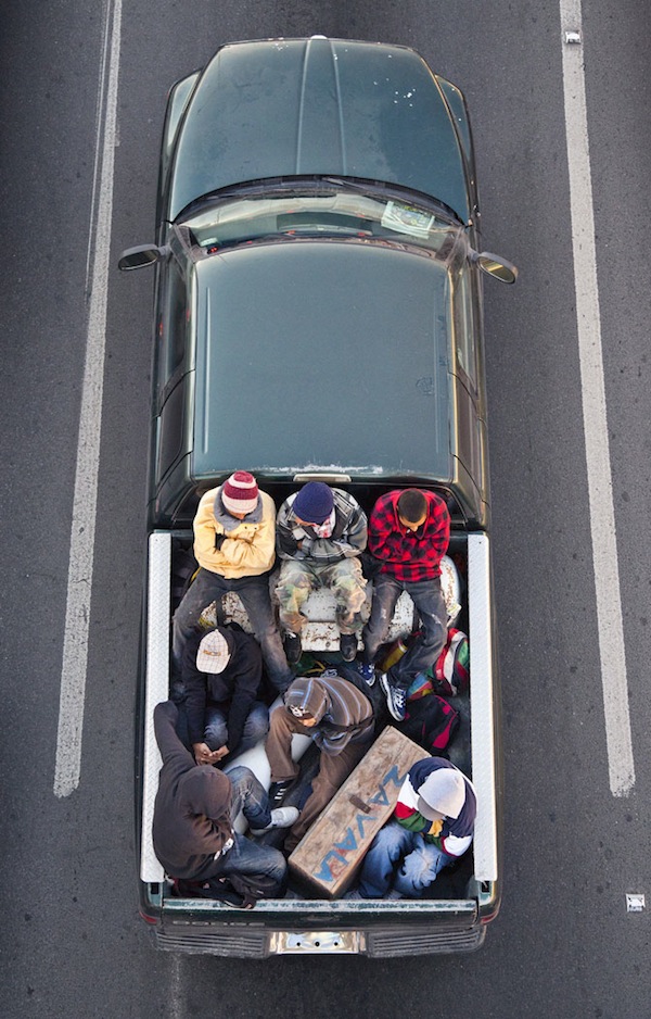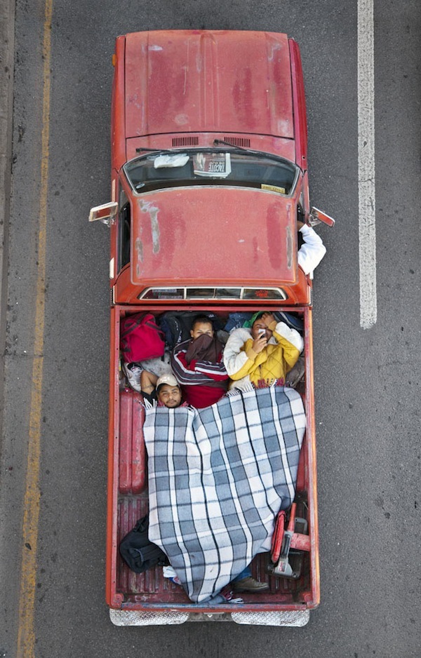 Alejandro Cartagena lleva más de un año capturando esta particular manera de viajar. «Me acerco una o dos veces a la semana a un puente peatonal localizado en una de las avenidas más grandes de Monterrey y espero hasta que pasan las camionetas», explica el fotógrafo dominicano, que llama el proyecto Car Poolers.