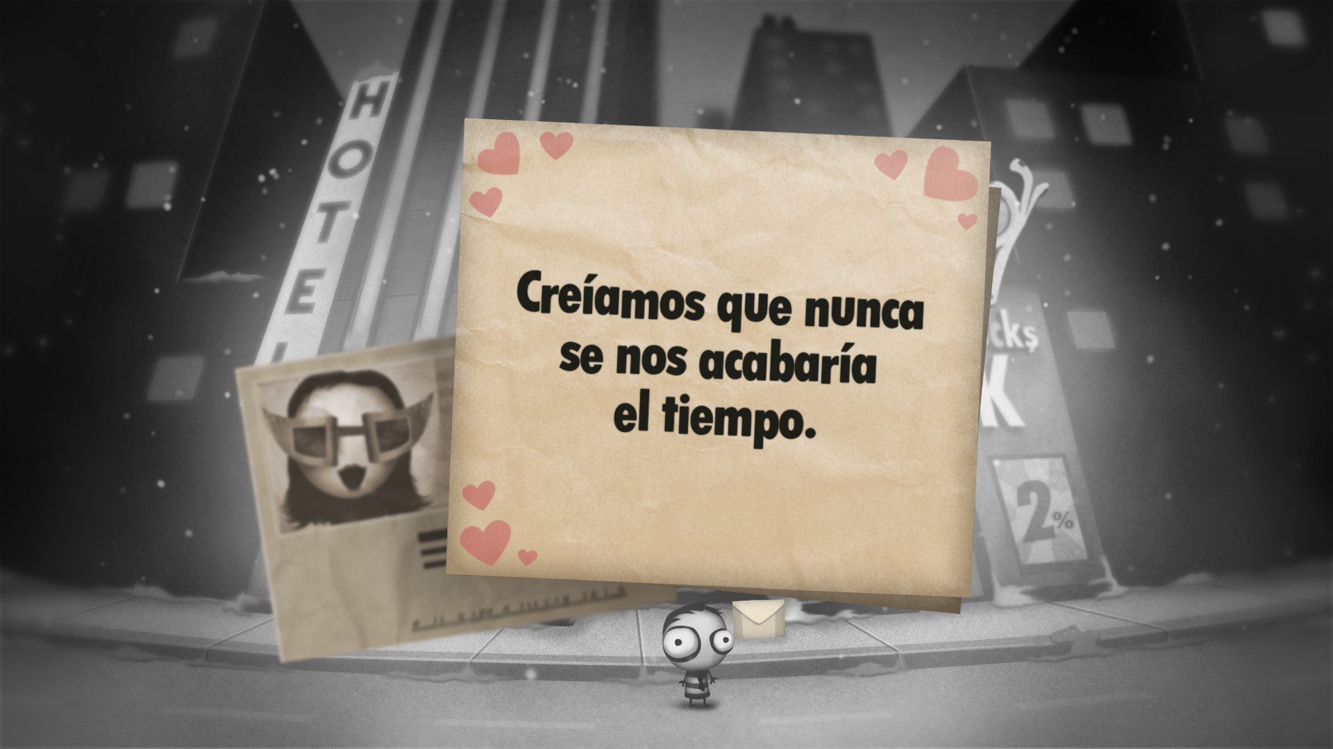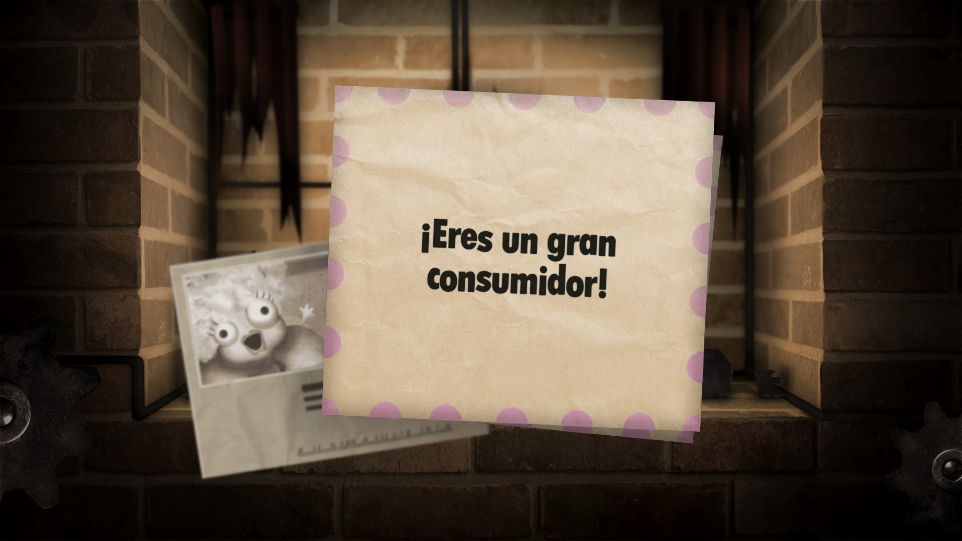 Little Inferno juego es más que un Farmville con cerillas. En ese fuego quemamos las chorradas que compramos en un Amazon demente para conseguir un calor artificial que nos protege del frío que dicen que hace en la calle. Lo que estamos quemando con esas llamas es nuestro tiempo, pero también los mensajes que nos envía Azucarilla, nuestra vecina de al lado, a la que solo conocemos por la correspondencia que nos manda desde el otro lado del muro. Con las noticias que nos manda el hombre del tiempo, con la garantía de la chimenea y con la propaganda que nos envía Tomorrow Corp. Ocurre exactamente lo mismo: a la hoguera. Estos mensajes son el vehículo por el que conocemos a los otros personajes y la historia, y duran lo que tardan en reducirse cenizas y en subir chimenea arriba en forma de humo para mezclarse con las emanaciones del resto de la ciudad.